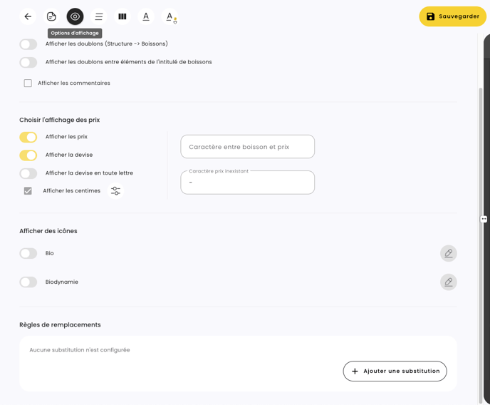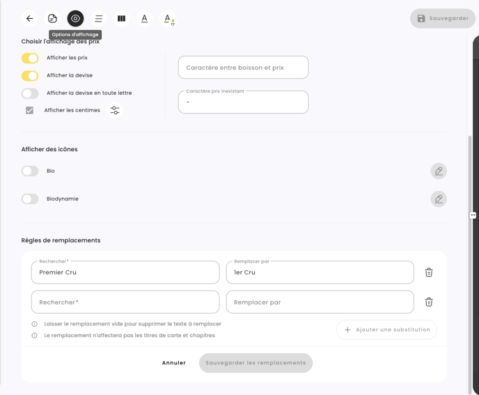 Vous souhaitez remplacer systématiquement "Premier Cru" par "1er Cru" ? Ou "Domaine" par "Dom." pour gagner de la place et améliorer la lisibilité de votre carte ? C'est possible, SOMM'IT va le faire pour vous automatiquement.