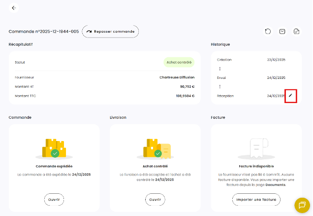 Pour cela, ouvrez la commande concernée et cliquez sur le petit stylo comme ci-dessous.