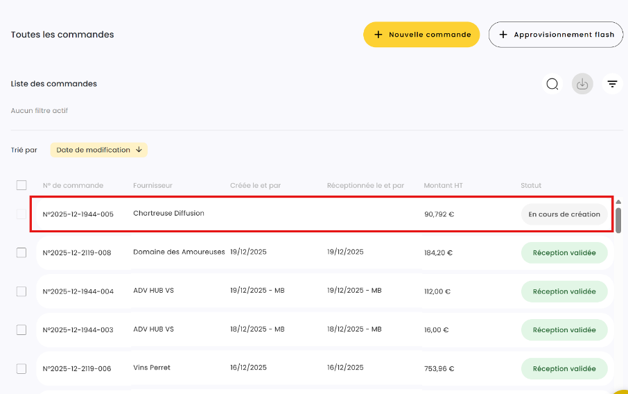 Vous retrouvez la commande au statut « en cours de création » depuis l'onglet "Voir toutes mes commandes" et pouvez à nouveau la modifier.